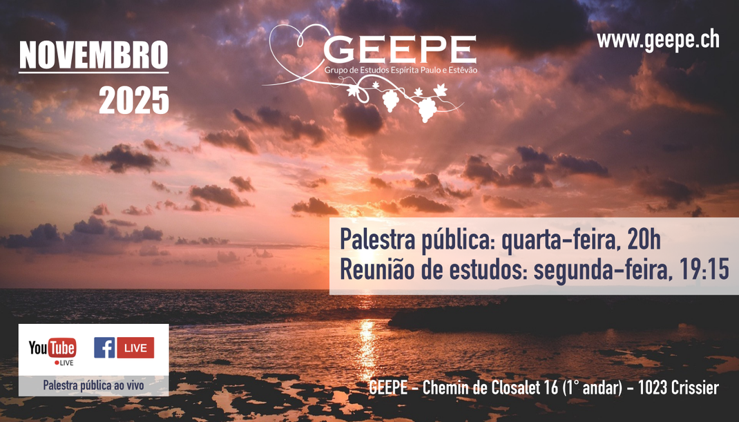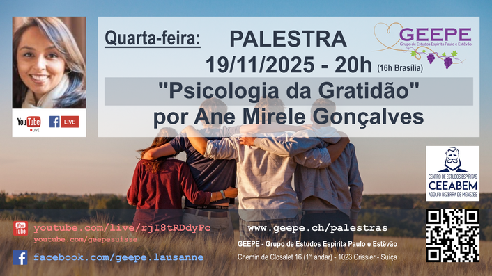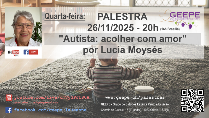 ![]() ![]() ![]() PALESTRA GEEPE 05/11/2025 - 20h Suíça (16h Brasília) O próximo e eu por Pedro Lúcio YouTube ao vivo: youtube.com/live/gf9K5c5FvCQ Facebook ao vivo: facebook.com/geepe.lausanne facebook.com/geepe.suisse ![]() CONFÉRENCE GEEPE 12.11.2025 - 20h Suisse Faire le bien sans ostentation par Claudia Giller YouTube en direct: youtube.com/live/nnzBknM463k Facebook en direct: facebook.com/geepe.lausanne facebook.com/geepe.suisse ![]() PALESTRA GEEPE 19/11/2025 - 20h Suíça (16h Brasília) Psicologia da Gratidão por Ane Mirele Gonçalves (CEEABEM) YouTube ao vivo: youtube.com/live/rjI8tRDdyPc Facebook ao vivo: facebook.com/geepe.lausanne facebook.com/geepe.suisse ![]() PALESTRA GEEPE 26/11/2025 - 20h Suíça (16h Brasília) Autista: acolher com amor por Lucia Moysés YouTube ao vivo: youtube.com/live/cmVyGPJfS0A Facebook ao vivo: facebook.com/geepe.lausanne facebook.com/geepe.suisse |