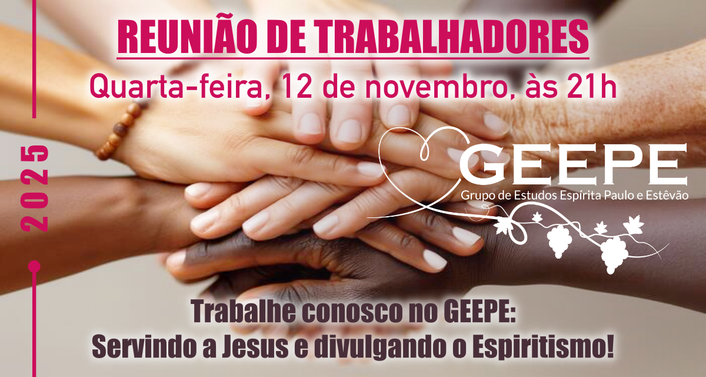 Convidamos todos os trabalhadores e voluntários do GEEPE a participarem da próxima Reunião de Trabalhadores, que acontecerá na quarta-feira, dia 12 de novembro de 2025, às 21h, logo após as nossas atividades. Os frequentadores que se sintam inspirados a contribuir com a nossa casa também são bem-vindos, a reunião é aberta a todos.