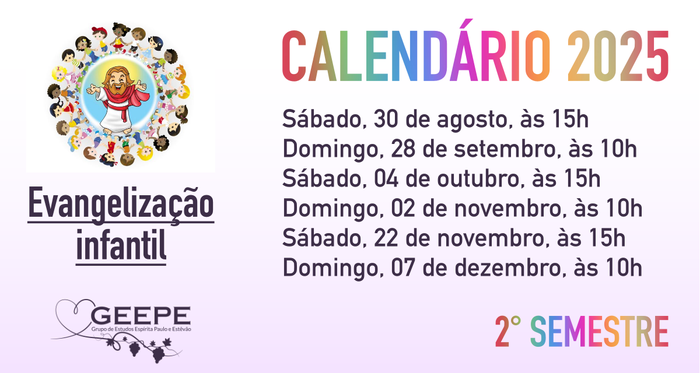 A evangelização infantil é realizada aos sábados, das 15h às 16h, ou aos domingos, das 10h às 11h,