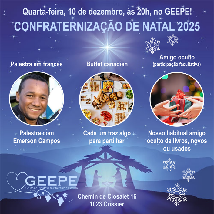 Nesta página, estão listados os eventos do GEEPE e de instituições amigas. Acompanhe as novidades e programe-se para participar dos próximos encontros que promovem aprendizado, união e crescimento em nossa comunidade espírita!