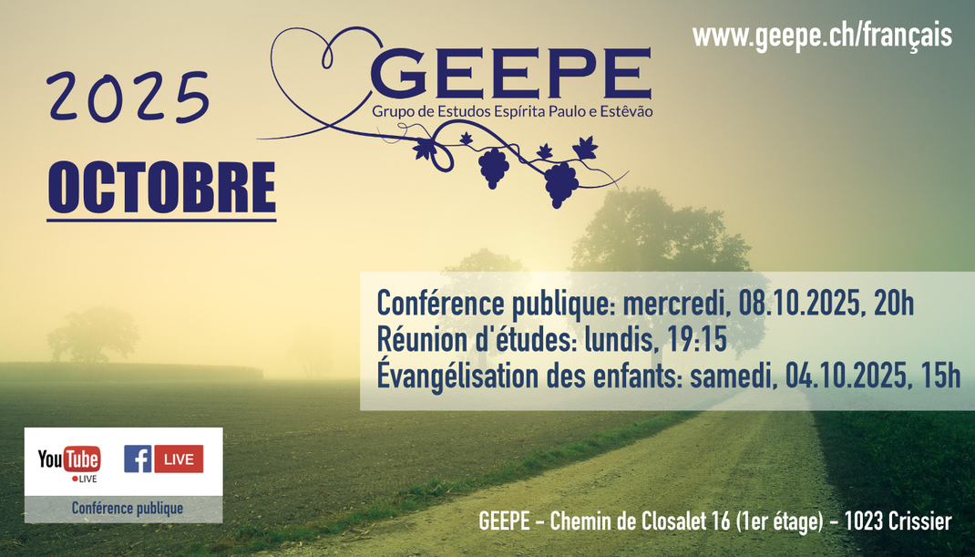 Notre conférence en français a lieu le deuxième mercredi du mois à 20h, suivie par le passe magnétique (si vous le désirez), ouverts à tout public intéressé. Ne manquez pas l'opportunité de nourrir votre âme avec les enseignements de la Doctrine Spirite!