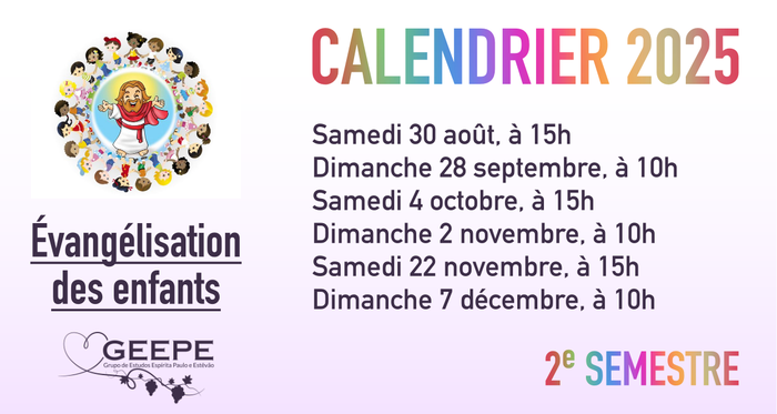 L’évangélisation des enfants est réalisée le samedi, de 15h à 16h, ou le dimanche, de 10h à 11h, conformément au calendrier ci-dessous. Simultanément, nous réalisons également une étude avec les parents. Amenez vos enfants pour découvrir l’Évangile de Jésus et profitez-en pour étudier avec nous le thème de la famille!
