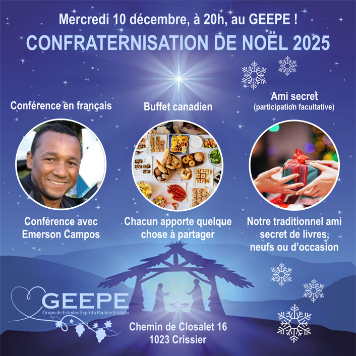 Le mercredi 10 décembre 2025, à 20h, nous aurons notre Confraternisation de Noël au GEEPE. Ce sera un moment spécial, rempli de joie, d’union et de bons sentiments. Nous remercions tous ceux qui pourront se joindre à nous pour partager cette rencontre chaleureuse!