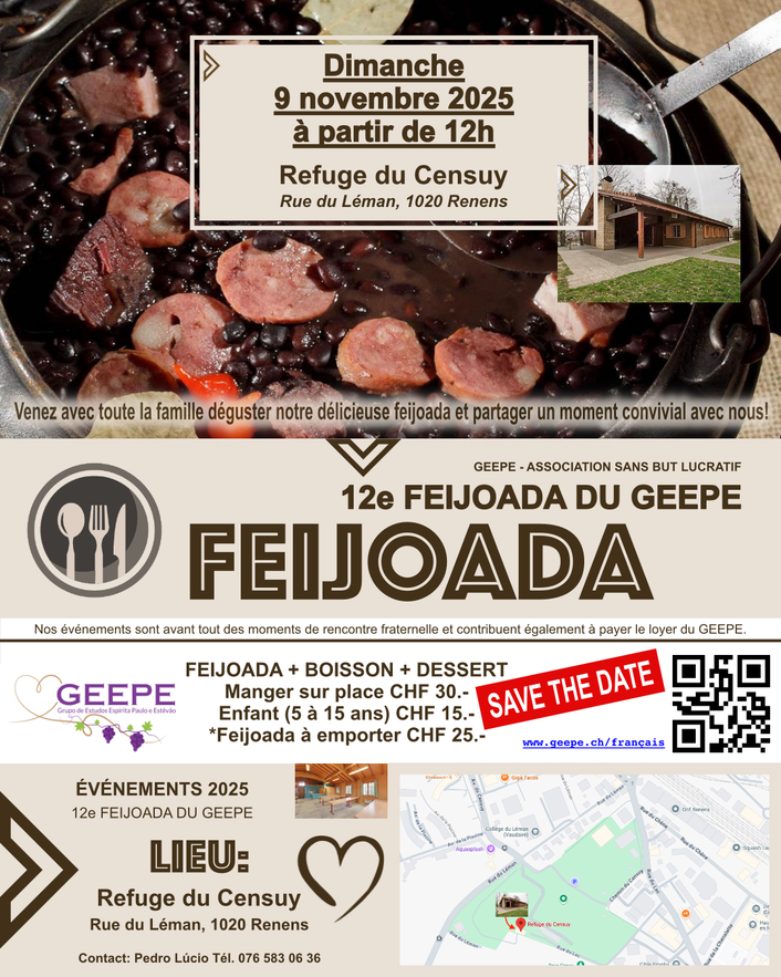 C’est avec une grande joie que nous vous invitons à la 12ème Feijoada du GEEPE, qui aura lieu le dimanche 9 novembre 2025, à partir de 12h, au Refuge du Censuy, à Renens. Venez savourer une feijoada préparée avec beaucoup d’attention, et profitez d’un après-midi convivial et joyeux en bonne compagnie. Plus d’informations: Pedro Lúcio – Tél. 076 583 06 36.